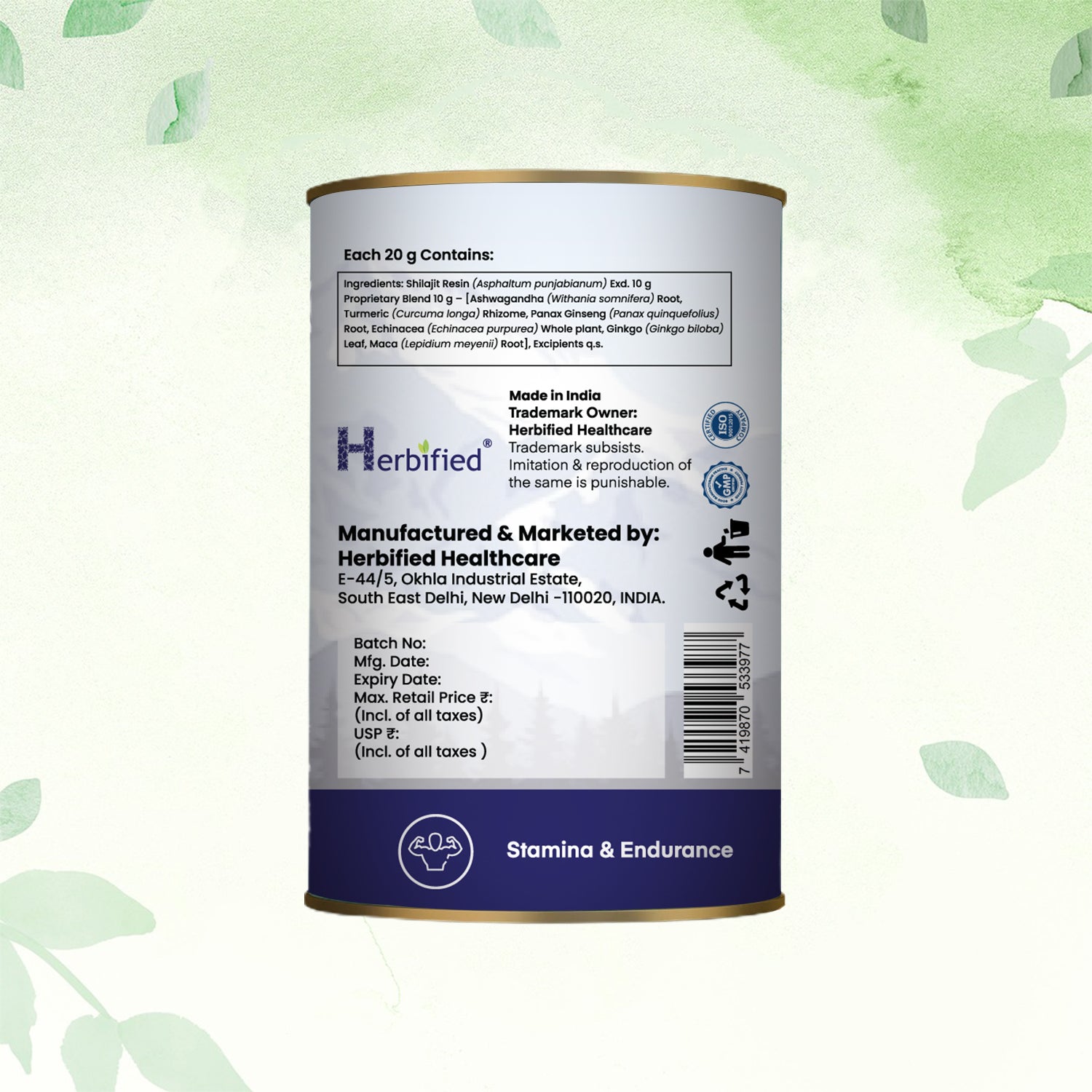 Herbified Shilajit Resin is infused with a blend of adaptogenic herbs like Ashwagandha, Echinacea, Ginkgo, Maca , Turmeric and Ginseng, which is designed to naturally boost energy levels, reduce fatigue, and promote mental clarity. Our resin has been meticulously processed to ensure maximum bioavailability. The synergistic combination of Shilajit and energy herbs ensures efficient absorption for optimal results.