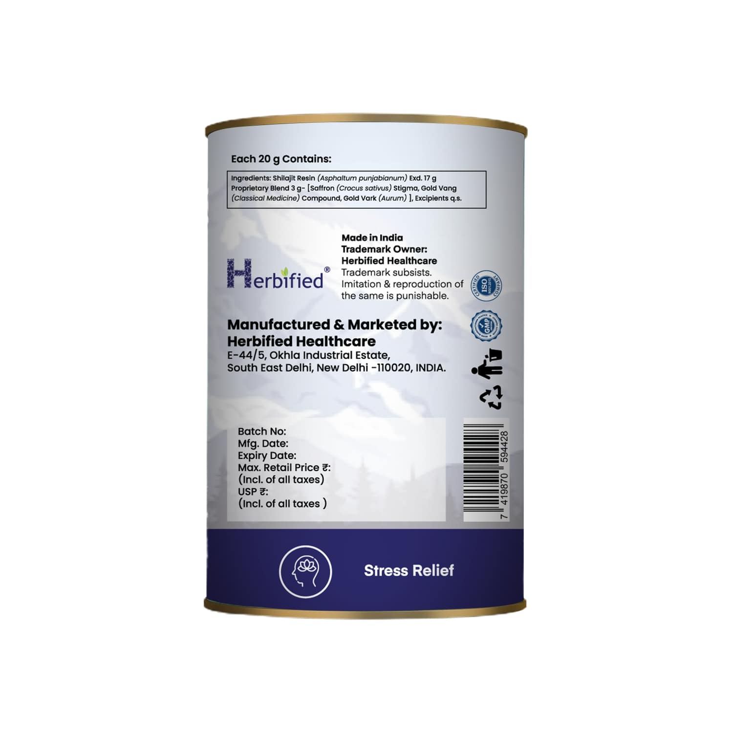 Herbified Shilajit Resin with Kesar & Gold is a combination of pure Shilajit resin,Gold Bhasma, Gold Vark,Gold Dust and Kesar. It is a potent Ayurvedic formulation known for its rejuvenating and revitalising properties. It is renowned for its ability to increase energy levels, enhance stamina, and combat fatigue while promoting overall wellness. The ingredients are also known to help with rejuvenation of body stamina, vigour, and vitality. The Gold in it acts synergistically to maintain and restore overall physical health .